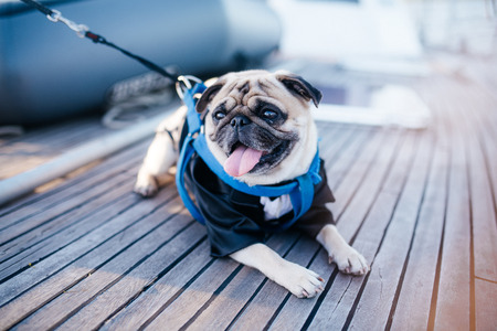 dog mops sits on the deck of a boat