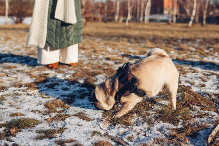 Woman walking pug dog in snowy winter park by frozen lake holding leash. Puppy wearing harness. Accessories for animals