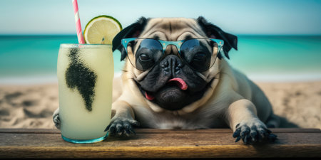 Pug wearing sunglasses and a Hawaiian shirt, sitting at a table with a tropical drink, cool and relaxed