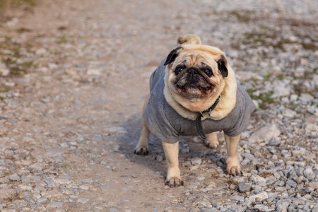 Small dog in nature. Funny pug in a warm sweater walks in the autumn park.