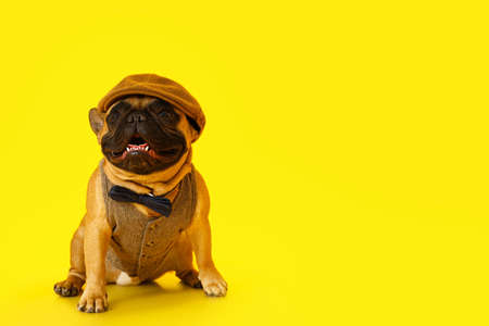 Portrait of cute pug dog in hat. Little smiling dog on bright trendy yellow background.