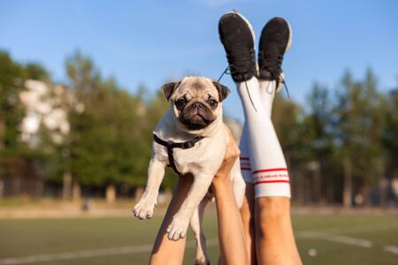 Cute pug dog with owner walking outdoors