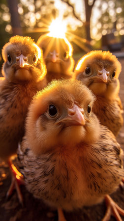 Selfie of chickens in a sunny botanical garden. Playful interaction of chickens in a lush garden. Generative AI