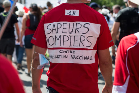 Mulhouse - France - 21 August 2021 - Portrait on back view of fire rescue men protesting against the compulsory vaccination in the street