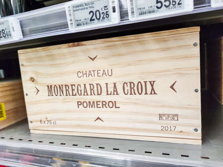 Builboreau, France - October 14, 2020: close-up of a wooden wine box containing a great French wine classified under the appellation pomerol