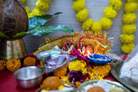 Bengali marriage rituals with beautiful decoration of multiple ingredient in brass bowls on a brass plate for bride and groom in Indian wedding
