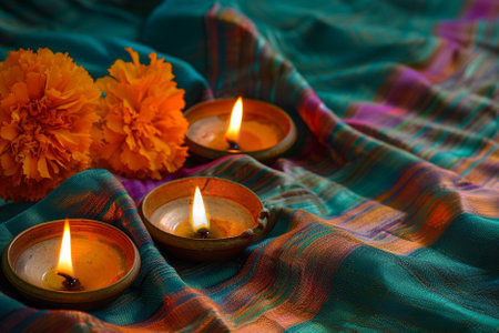 Diwali Decor. Festive arrangement of marigold flowers and decorative lamps for celebration.