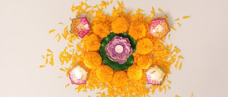 Top view overhead clay lit Diya or oil lamp and yellow flower, studio shot on concrete background, Decoration of Hinduism rangoli, Happy Deepavali or Diwali festival concept