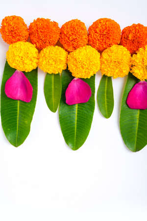 Vibrant Floral Marigold and Jasmine Border for Republic Day of India Celebration. Concept of Indian Festivity, Cultural Decoration, Traditional Celebration, Frame. Copy space.
