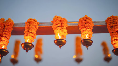 Intricate decor of a mandap with ornate floral arrangements and luminous oil lamps. concept of traditional indian celebrations, cultural symbolism, festive ambiance.