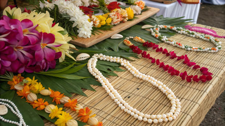 A joyful man stands by the beach, adorned with a vibrant floral crown and a necklace made of blossoms. His warm smile reflects the festive atmosphere of a local celebration, showcasing a rich cultural heritage and connection to the community.