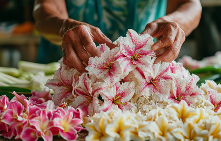 A craftsman intently creating vibrant lei garlands at a local market