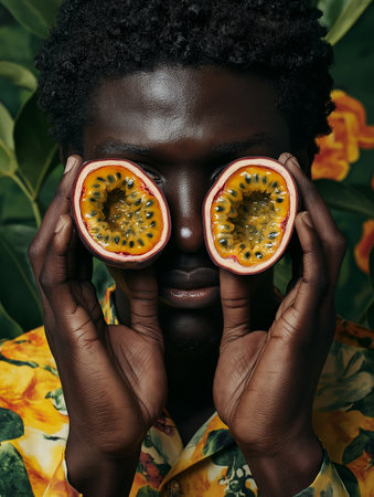 Portrait of a beautiful african american woman covering her eyes with passion fruit.