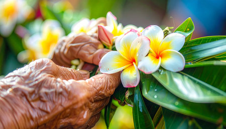 In a moment of quiet reflection, the weathered hands of an elderly person gently cup a cluster of fresh plumeria blossoms.