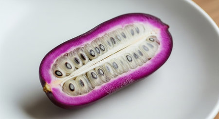 Half of a ripe passion fruit revealing its vibrant yellow pulp and dark seeds. a tropical, healthy, and exotic fruit rich in vitamins.