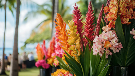 Colorful ginger flowers used in a tropical flower arrangement for an outdoor event, with palm trees in the background.