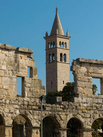 Part of the Pula Arena, the sixth largest amphitheater of its kind, with a blue sky , church and flowers in Croatia, Europe