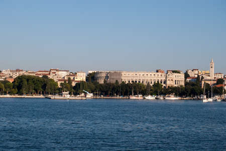 Romanesque monuments in the city of Pula, arena or colosseum, columns, arches, facades and walls.