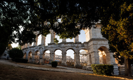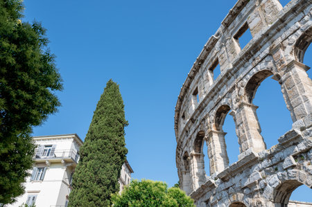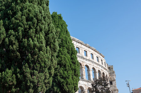 Part of the Pula Arena, the sixth-largest amphitheater of its kind, with green trees and a blue sky in Croatia, Europe