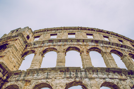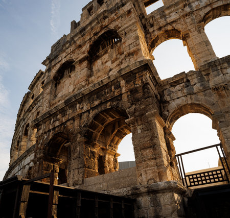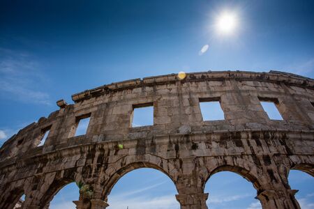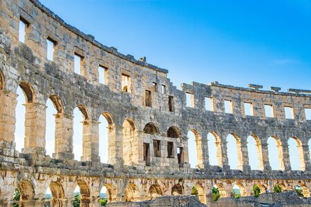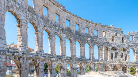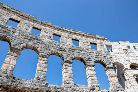 Ancient heritage in Pula, Istria, Croatia. Arches of monumental ancient Roman arena. Detail of historic amphitheater, wide angle view of high walls on blue sky background.
