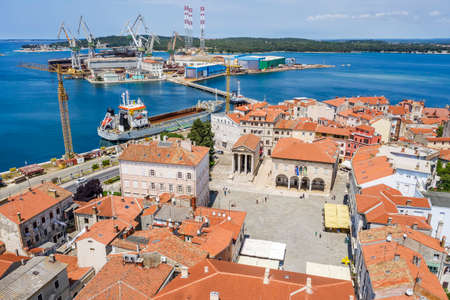 an aerial view of city square Forum in Pula, in background remains of former shipyard in Pula, Istria, Croatia