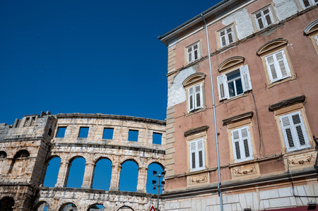 Part of the Pula Arena, the sixth largest amphitheater of its kind, with blue sky and an older house in Croatia, Europe