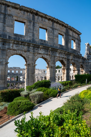 Pula, Croatia - July 12, 2022: The Pula Arena is a Roman amphitheater. It was constructed between 27 BC and AD 68 and is among the worlds six largest surviving Roman arenas