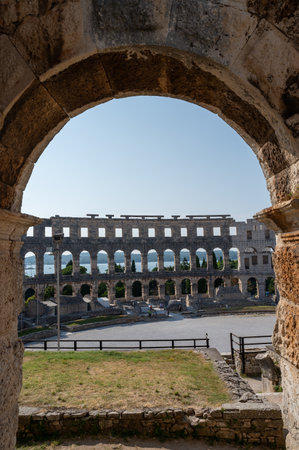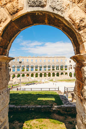 View through a stone arch of a wall of the Pula amphitheater, the sixth largest amphitheater of its kind in Croatia, Europe