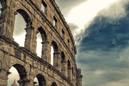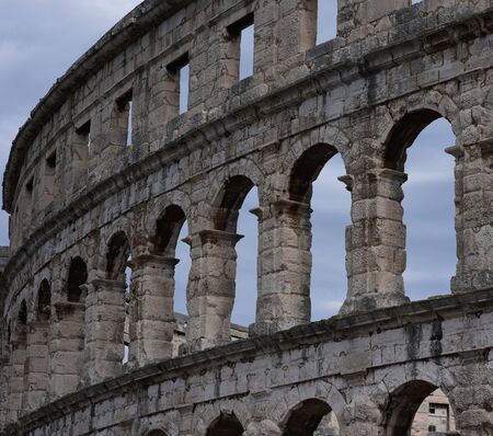 Detail photo of Pula Arena, Istria, Croatia. Travel destination. Ancient architecture.