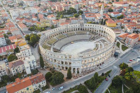 Arena Pula. Ancient ruins of Roman amphitheatre in Pula aerial evening view, Istria region of Croatia