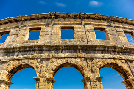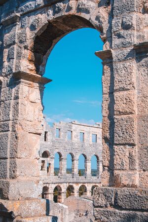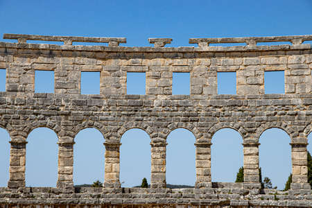 Ancient heritage in Pula, Istria, Croatia. Arches of monumental Roman arena. Detail of historic amphitheater, wide angle view of walls on blue sky background.