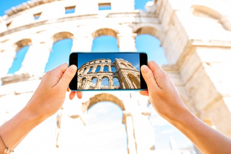 Female hands photographing with smartphone ancient amphotheatre in Pula, Croatia