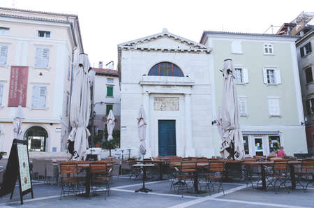 Scenic view of narrow empty streets of historical center of old town Piran against the sunrise sky and Adriatic sea with yachts. Summer vacation to coast of Slovenia.