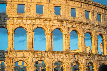 Inside of Ancient Roman Amphitheater in Pula, Croatia, Famous Travel Destination, in Sunny Summer Evening