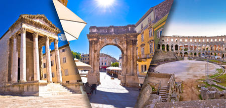 Town of Pula historic Roman landmarks panoramic collage tourist postcard view, Istria region of Croatia