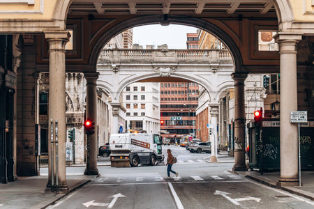 Genoa, Italy - September 22, 2024: Elegant arcaded facades and ornate historic buildings line Via XX Settembre, the city’s main shopping street.