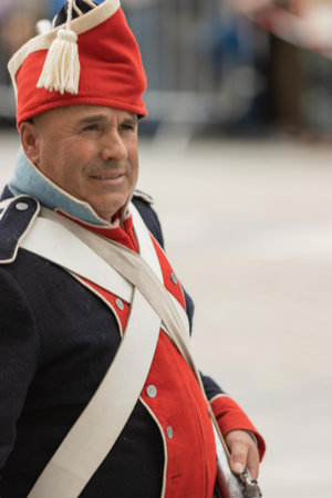 Concord, USA - April 16, 2011: British soldiers fight the Minute Man on Battle Road in Concord, MA during the Commemorating the Patriot Day
