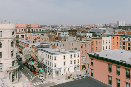 Elderly architecture meets modern life with people and cars moving through a vibrant city street under a blue sky.