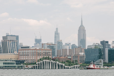 Visitors relax at the waterfront while admiring the skyline of New York City featuring famous buildings and calm water.