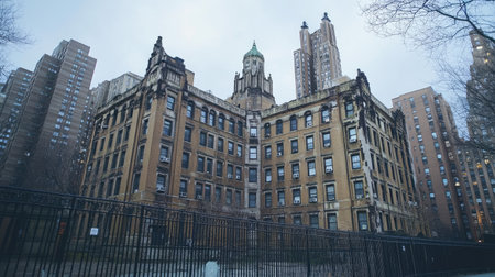 A captivating image of a historic urban building showcasing ornate architecture amidst modern skyscrapers, creating a stunning cityscape at dusk.