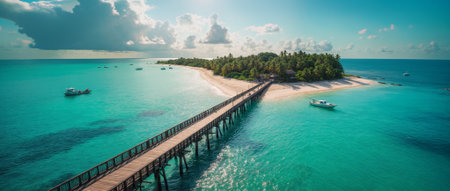 Long wooden boardwalk stretches across crystal-clear turquoise lagoon to verdant island paradise, with luxury beachfront bungalows nestled among swaying palms and boats anchored offshore.