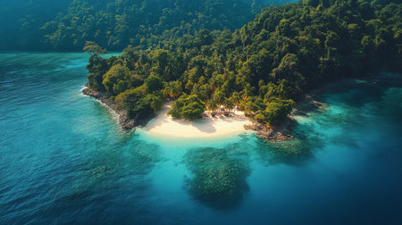 Experience a breathtaking aerial view of a secluded tropical island, featuring lush greenery, soft sandy beaches, and sparkling blue waters, perfect for escape and relaxation.