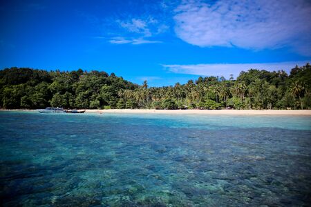 Trees showing idyllic tropical island with palm trees and a small wooden boat in crystal clear turquoise water.