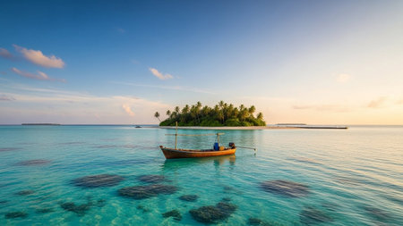 Discover a tranquil tropical island oasis, featuring vibrant palm trees and crystal-clear water surrounded by serenity, ideal for vacation and relaxation themes.