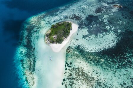 Small coral reef island with white sand beach. Aerial drone view from above. Tropical background.