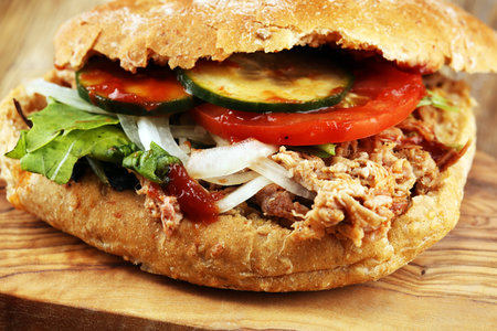 Ciabatta bread sandwich with pulled pork and vegetables