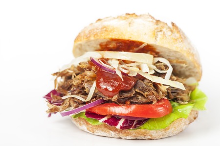 homemade pulled pork burger with caramelized onion and bbq sauce