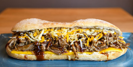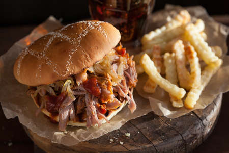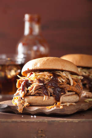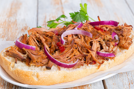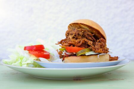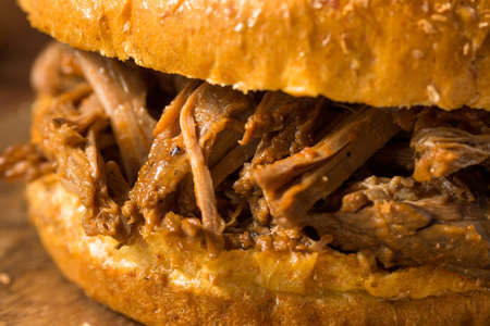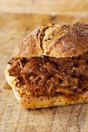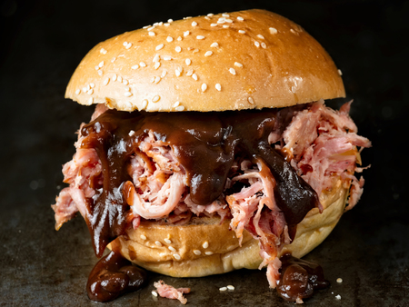 close up of rustic american barbecued pulled pork sandwich