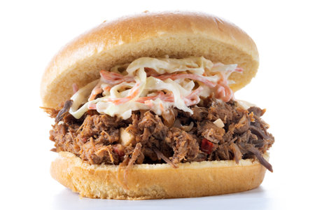Pulled pork sandwich with coleslaw salad isolated on white background
