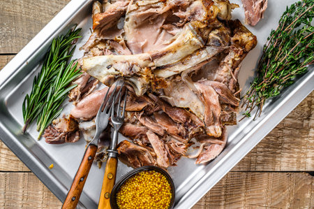 Roast pork knuckle eisbein meat on a baking pan with herbs. Wooden background. Top view